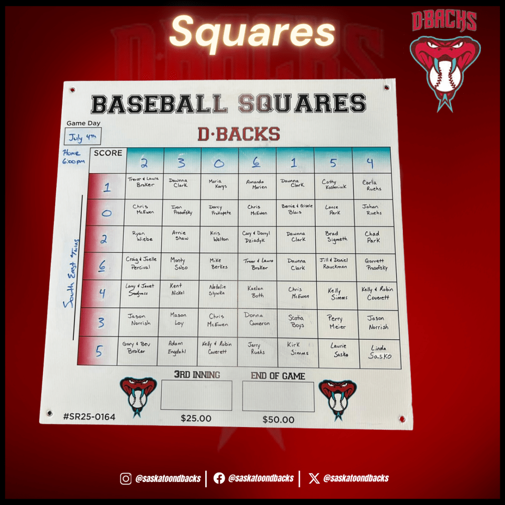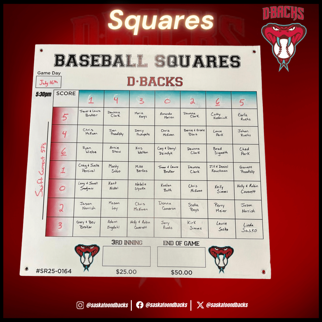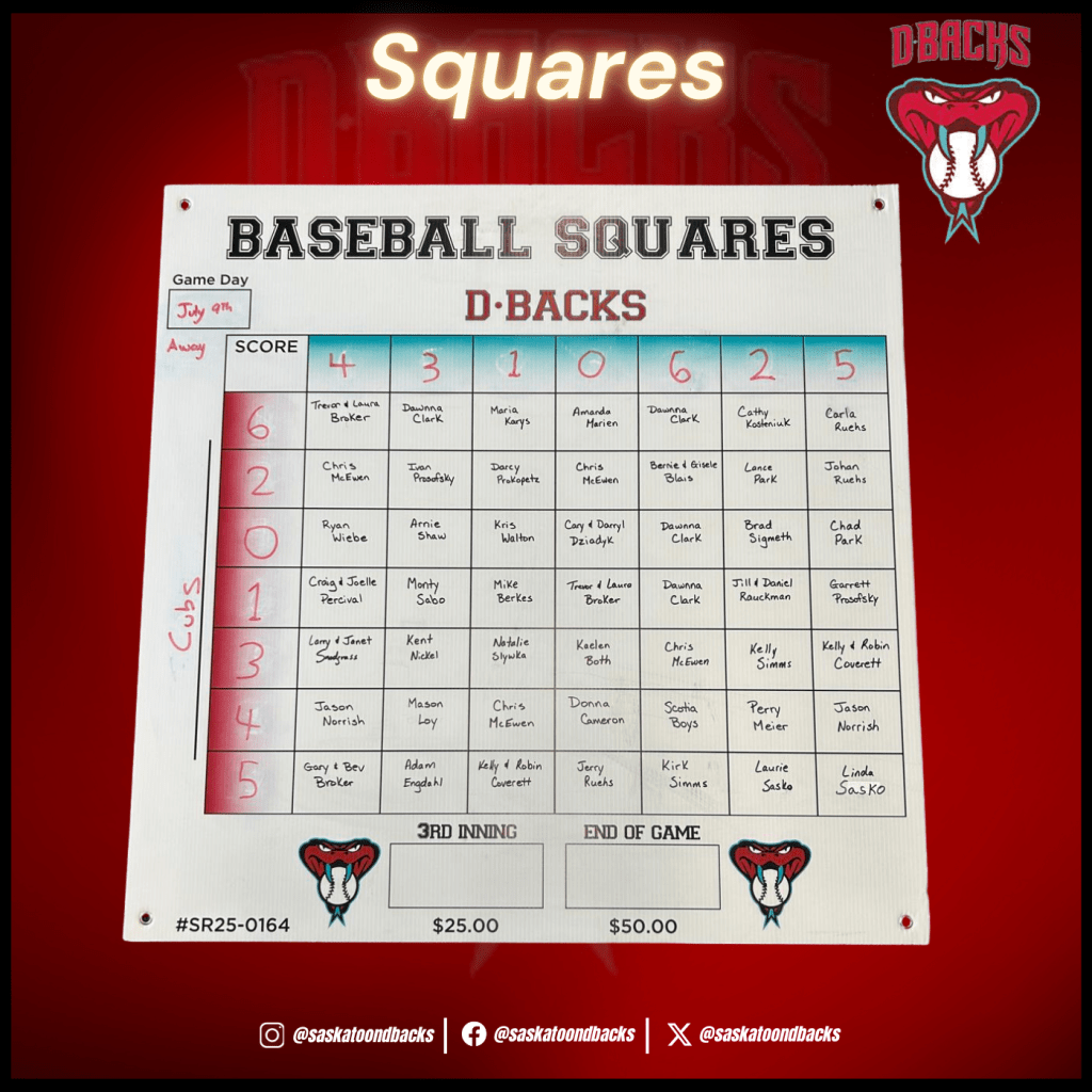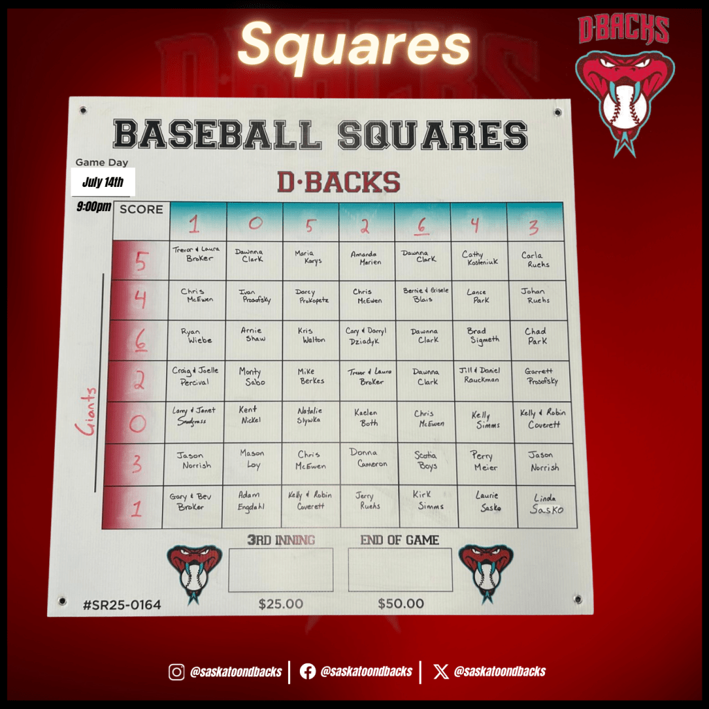 The DBacks have two against the Twins tonight so that means four chances to win for our square players!